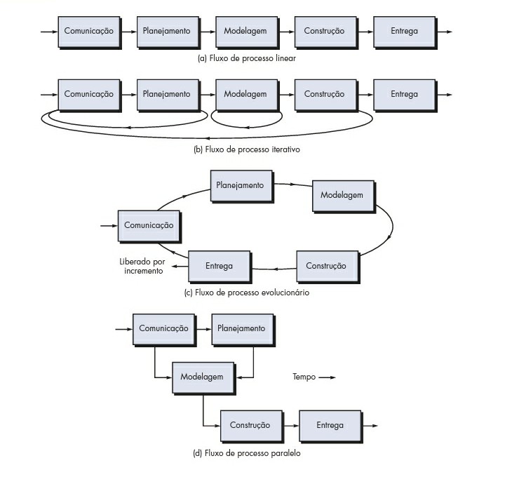 Um fluxo de processo linear executa cada uma das cinco atividades metodológicas em sequên- cia, começando com a de comunicação e culminando com a do emprego (Figura). Um fluxo de processo iterativo repete uma ou mais das atividades antes de prosseguir para a seguinte (Figura). Um fluxo de processo evolucionário executa as atividades de uma forma "circular". Cada volta pelas cinco atividades conduz a uma versão mais completa do software (Figura). Um fluxo de processo paralelo (Figura) executa uma ou mais atividades em paralelo com outras atividades (por exemplo, a modelagem para um aspecto do software poderia ser executada em paralelo com a construção de um outro aspecto do software).