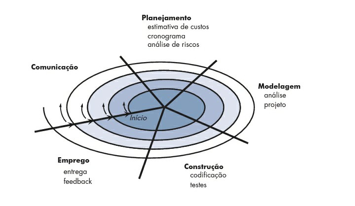 Modelo Espiral. Originalmente proposto por Barry Boehm [Boe88], o modelo espiral é um modelo de processo de software evolucionário que acopla a natureza iterativa da prototipação com os aspectos sistemáticos e controlados do modelo cascata. Fornece potencial para o rápido desenvolvimento de versões cada vez mais completas do software. Boehm [Boe01a] descreve o modelo da seguinte maneira: O modelo espiral de desenvolvimento é um gerador de modelos de processos dirigidos a riscos e é utilizado para guiar a engenharia de sistemas intensivos de software, que ocorre de forma concorrente e tem múltiplos envolvidos.